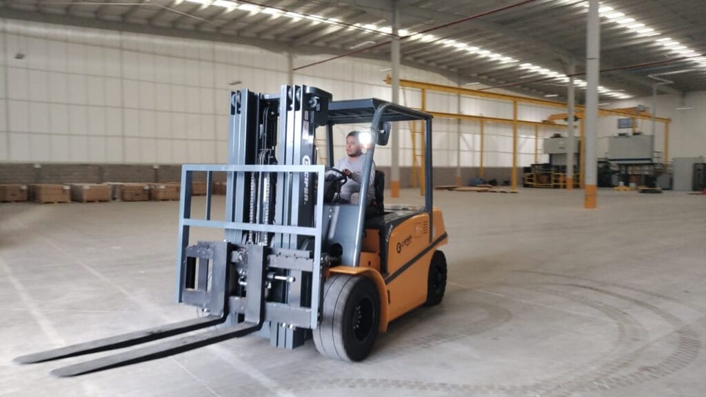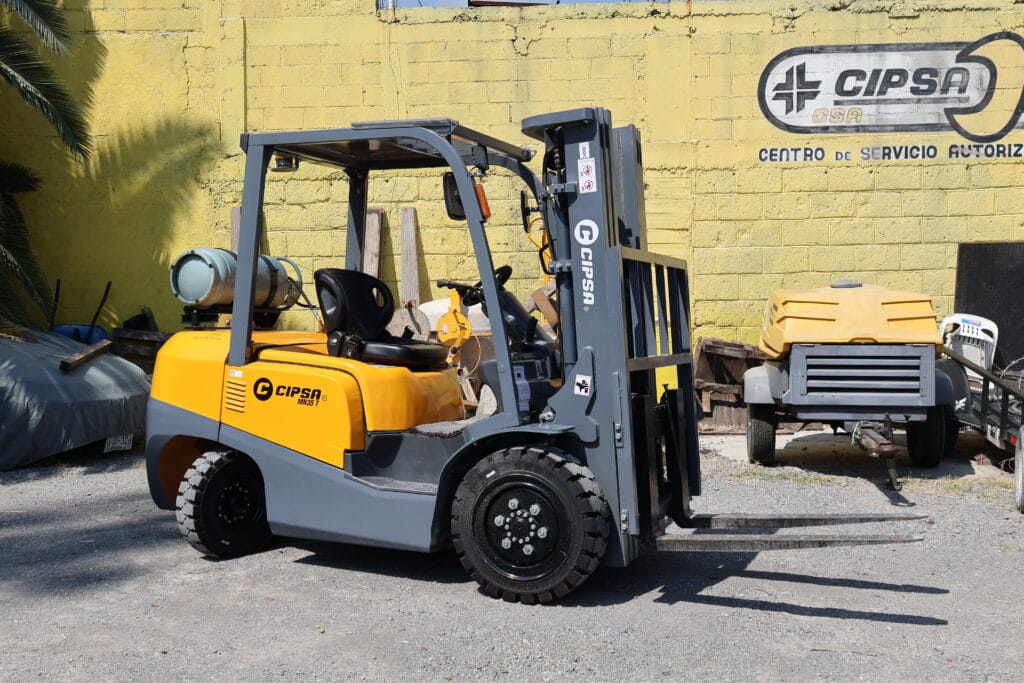 Montacargas de combustión ideal para trabajos en exterior, carga y descarga de materiales en obras, almacenes y zonas industriales.